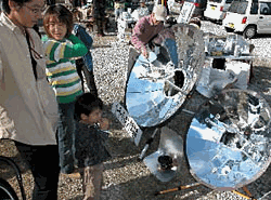 In der Mitte der Parabolform ein Topf oder eine Pfanne, so wird gekocht. Die Leute, die zum ersten Mal den Solarkocher sahen sagten erstaunt „Das funktioniert ja”. Am 2. Nov in Chiba auf der Ökomesse Chiba |